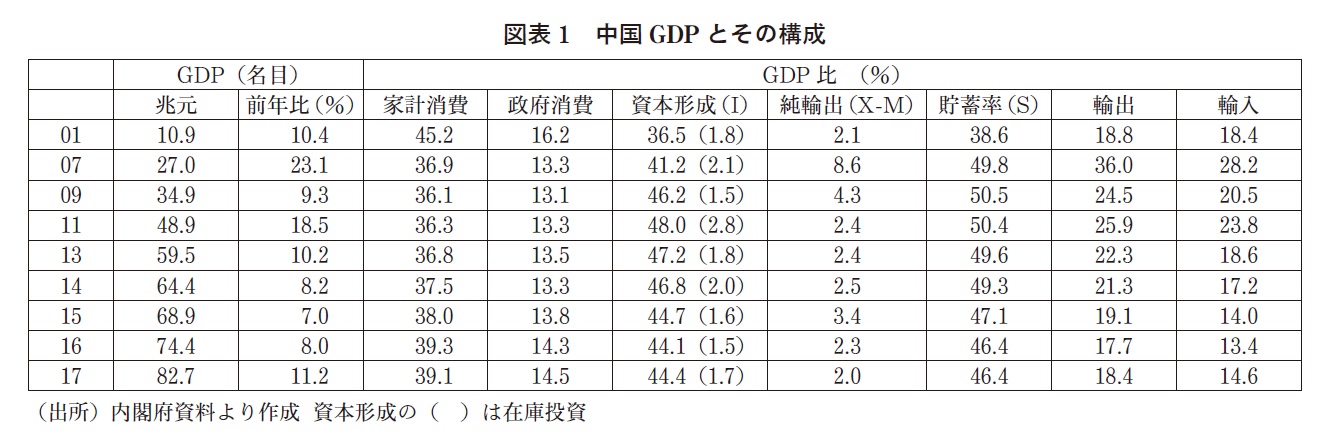 (1)21世紀の中国経済は、輸出拡大が原動力で、投資に波及し、高度成長が所得を増やし、貯蓄を増大した。貯蓄(S)=投資(I)+純輸出・経常収支(X-M)の定義通り、増大した貯蓄は急増する投資と経常収支の黒字を賄った。4兆元対策後は、貯蓄率はGDP5割弱を占めたが、最近も46%を維持する。その反面は、縮んだ消費で、2001年45%だった家計消費は4割を回復していない(図表1)。