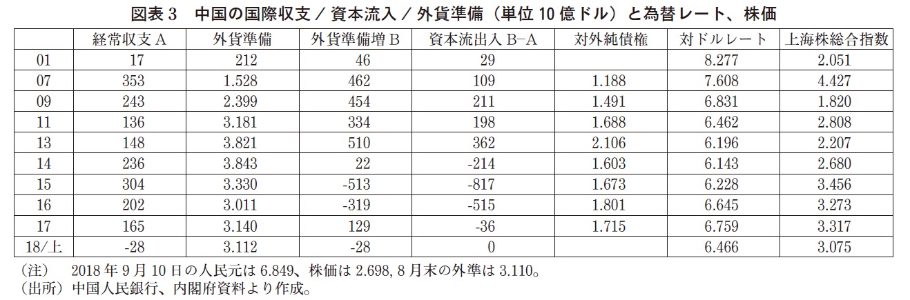しかし、2014年には、経済減速の上、為替レートも01年の8.277から6.143と3割上昇し、輸出競争力の低下がみられた。2015,16年には輸出が減少し、上海総合指数が5千から3千を割り、為替レートも6.9まで下落した。巨額の資本流出が起こり(図表3、B-A欄)、外貨準備は、2017年初3兆ドルまで下落した。2015年は、中国がアジアインフラ投資銀行を設立し、人民元のSDR通貨入りも果たした光栄の年であったが、新常態移行の矛盾が噴出した年でもあった。人民元の国際化は以来停滞している。