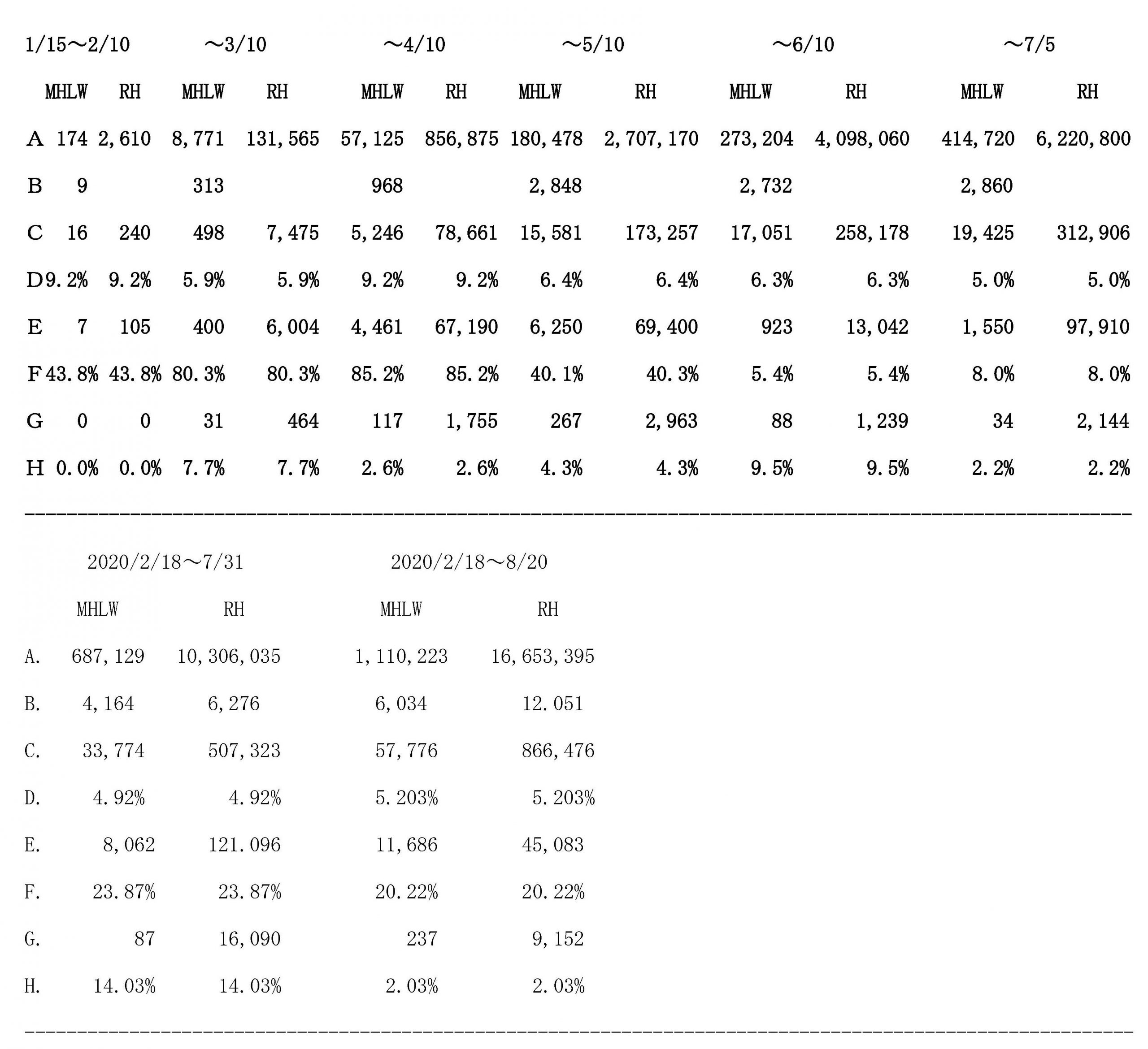(資料2.2) 2020年1月15日~2020年8月20日午前0時:厚生労働省公表データ(MHLW)と廣野推計値(RH)